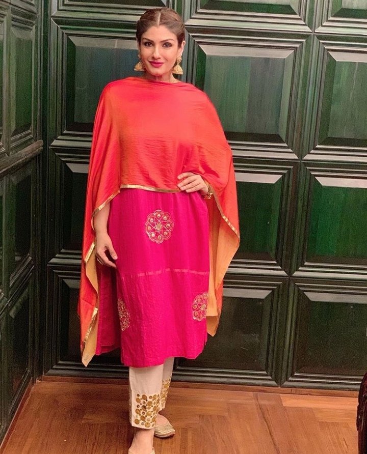 Raveena Tandon’s fushcia pink kurti was accentuated by subtle floral embroideries and side slit. She teamed it with off-white fitted bottoms, which featured golden embellishments. She draped a beautiful dupatta, which was dipped in two shades – orange and yellow. She completed her look with matching traditional juttis. She spruced her look with golden toned jhumkas.
